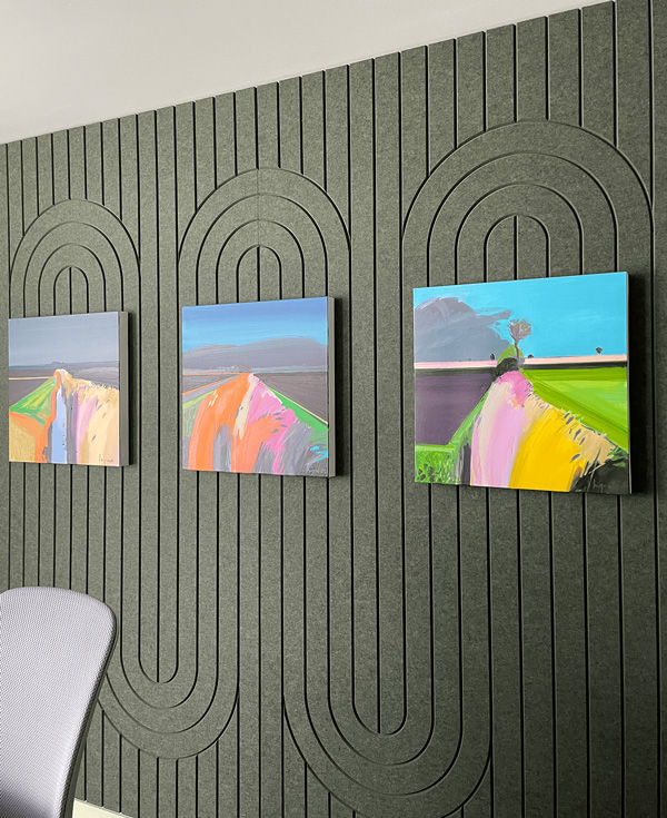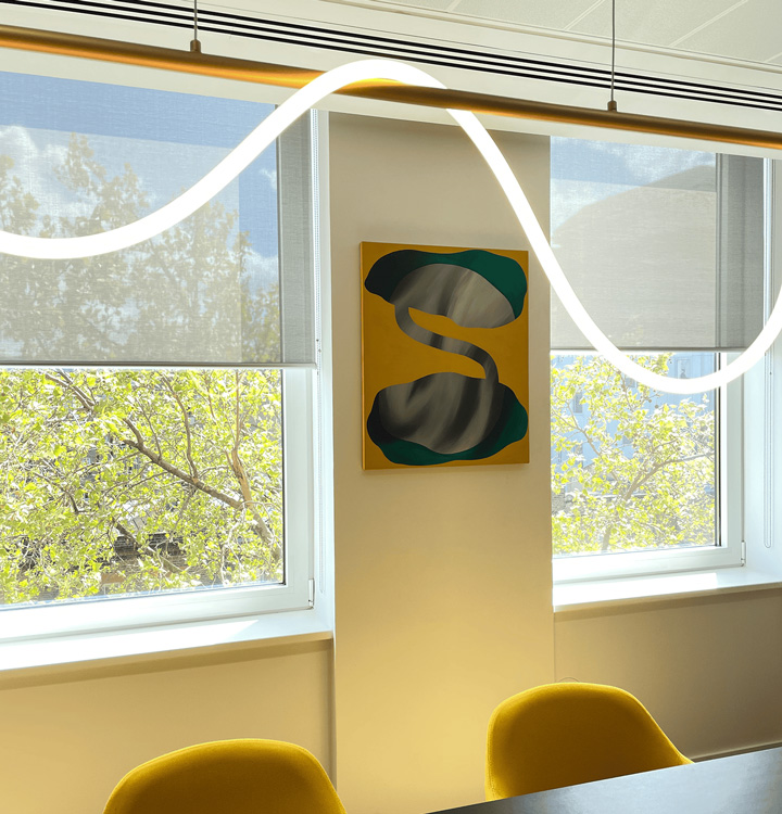 Nous avons ensuite présenté une collection d’œuvres d’art sélectionnées en fonction des centres d’intérêt du client. Une attention particulière a été portée aux « listening rooms », une série de salles d’entretien dédiées aux échanges avec les clients, où les œuvres ont été placées de manière stratégique afin d’offrir un arrière-plan visuel varié lors des appels professionnels.